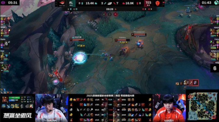 [15:31]先锋团,野区混战,Kanavi皇子火锅盖两嗯,Creme阿卡丽再切王杰反手再杀shanks拿到双杀,但自己被Tarzan蔚击杀,双方打出2换2,TES经济领先1k。