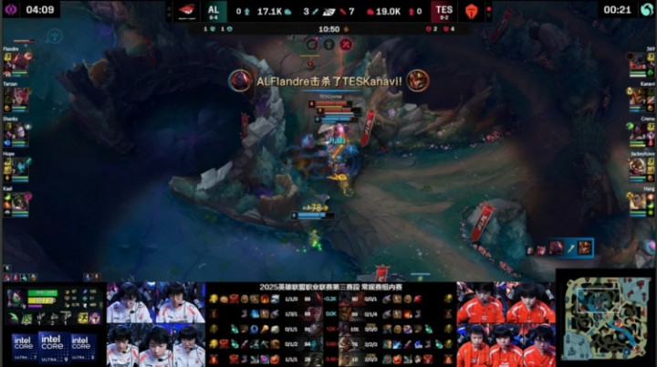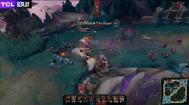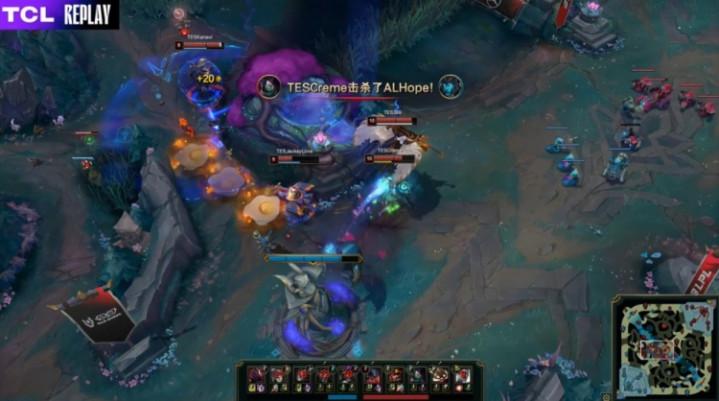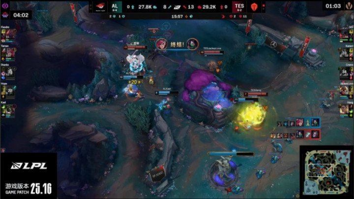 [13:19]TES三人入侵AL野区,双方混战,Hang芮尔开shanks,Creme阿卡丽切掉王杰卡莉丝塔,TES打出1换4,经济领先2k。