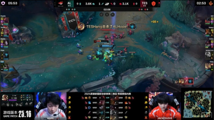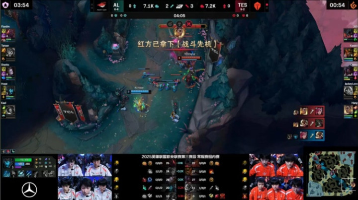 [25:54]TES入侵AL野区,hang芮尔吸两人,TES瞬间打出0换3,回头吃掉大龙,经济领先5k。