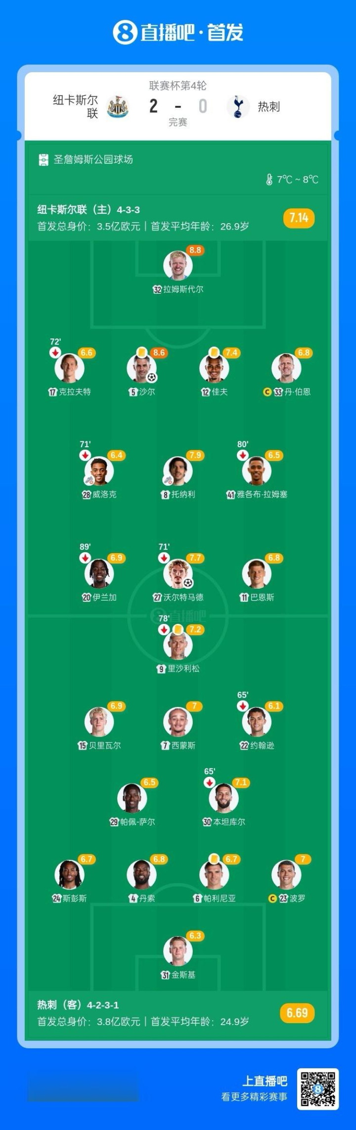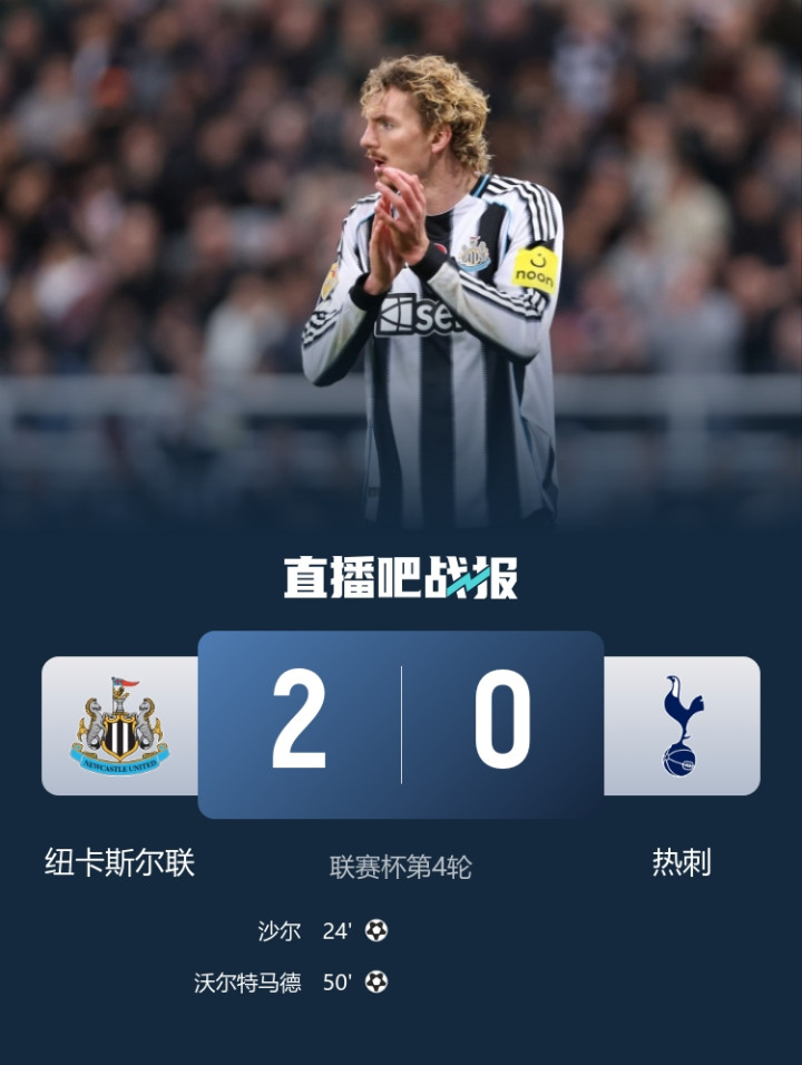 直播吧10月30日讯北京时间10月30日凌晨4时整,2025-26赛季联赛杯第4轮在圣詹姆斯公园球场展开角逐,纽卡斯尔联主场迎战热刺。上半场沙尔先拔头筹,托纳利角球助攻,下半场沃尔特马德头球扩大比分,威洛克助攻。最终纽卡斯尔联主场2-0淘汰热刺晋级联赛杯8强,纽卡取得各赛事3连胜,热刺近4场仅1胜。