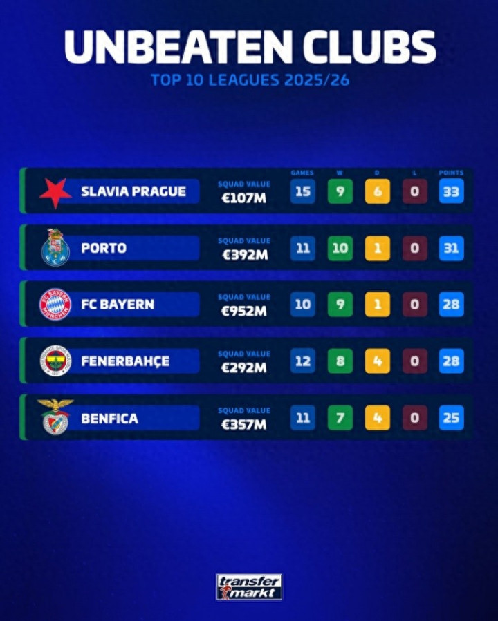 来自德国转会市场的数据统计,前十联赛本赛季至今仅有五支球队在联赛中依然保持不败,其中葡超两队,德甲、土超、捷甲各一队。