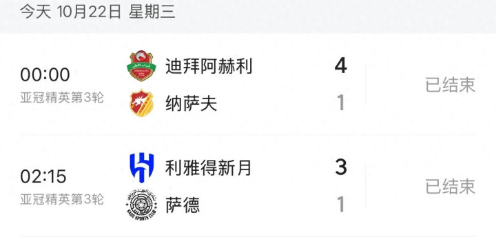 迪拜阿赫利4:1击败了纳萨夫,利雅得新月3:1击败萨德。这样最新积分榜排名如下: